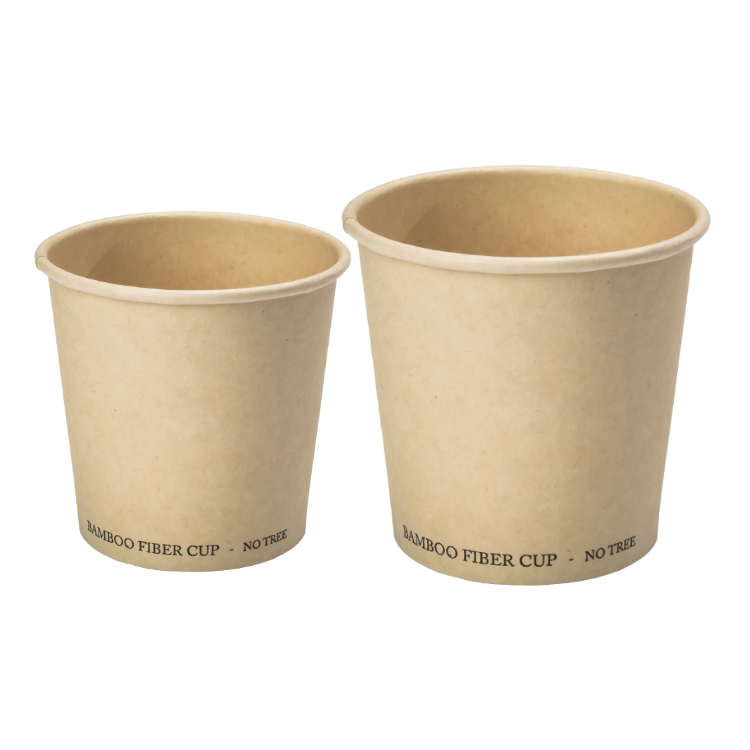 Copo de papel produzido com fibra de bambu, disponível nos tamanhos 110ml e 210ml.