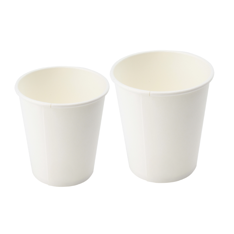 Copo de papel branco disponível nos tamanhos 110ml e 190ml.